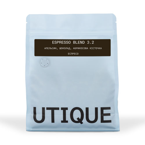 Espresso Blend 3.2 (еспресо суміш) - купаж бразильської арабіки натуральної обробки, ефіопської арабіки митої обробки та індійської арабіки митої обробки. Смакові характеристики: апельсин, шоколад, абрикосова кісточка. Чудовий баланс солодкості, м'якої гірчинки та кислинки. З цього бленду виходить збалансований еспресо з ароматом шоколаду та абрикосової кісточки, природною солодкістю й щільним тілом
