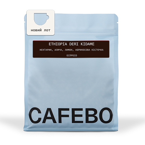 Ethiopia Deri Kidame (Етіопія Дері Кідаме) — етіопська арабіка митої обробки з регіону Гуджі, Західна Оромія, вирощена на висоті 1800–2200 метрів над рівнем моря. Кавові дерева ростуть на родючих червоно-бурих вулканічних ґрунтах, що забезпечують повільне та рівномірне дозрівання ягід. Це надає чашці щільності, глибини та складного ароматичного профілю. Лот сформований із локальних етіопських гібридів — автохтонних сортів, що передають природну багатошаровість смаку, притаманну лише цьому регіону. Плоди для обробки надходять на станцію Deri Kidame, що належить компанії Tracon Trading. Хоча більшість кави із цієї станції — натуральної обробки (через високий попит та виняткову якість місцевої вишні), команда активно розвиває напрямок митої ферментації. Обробка розпочалась з ретельного відбору лише стиглих червоних вишень. Після доставки ягід на станцію їх депульпували, залишаючи тонкий шар мусиляжу. Далі відбулась ферментація, під час якої зерно вимочувалось у джерельній воді біля 24 годин. За цей час природні ферменти розщепили залишки мусіляжу. Далі зерно пройшло промивання у каналах з водою для повного очищення та сортування за щільністю. Після миття зерно, все ще в пергаменті, спершу сушилось у тіні протягом кількох днів (до досягнення вологості 30%), а потім — на сонці на піднятих африканських ліжках ще близько двох тижнів, поки вологість не знизилась до стабільних 11%