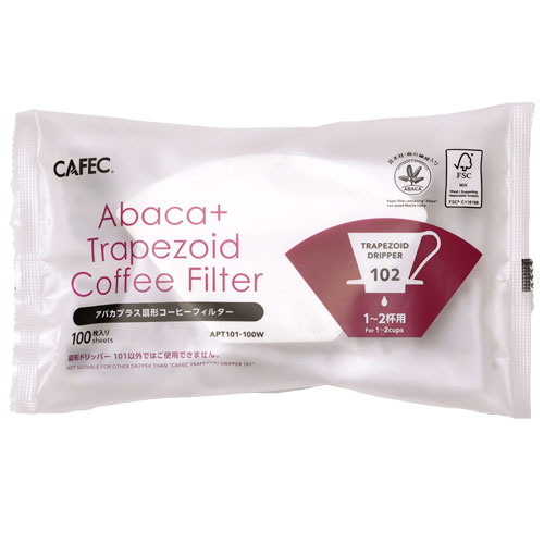 Фільтри паперові CAFEC ABACA+ Trapezoid Filter Paper 102 мають трапецевидну форму. Розмір 102 використовується для заварювання 3-5 порцій кави у пуроверах типу 102 (Kalita 102, Wilfa, Cafec 102, Bonmac тощо). Фільтрувальний папір ABACA Plus виготовлений зі зменшеного по висоті двостороннього "крепу" за новою технологією виробництва Fine-Grained, завдяки чому вдалося збільшити площу поверхні паперу за рахунок зменшення відстані між шарами "крепу". Це дало можливість залишити прийнятну швидкість фільтрування одночасно з підвищеною щільністю фільтрувального матеріалу. Також структура фільтрувального паперу має кращу рівномірність розподілу паперового волокна, що дає необхідний контроль потоку води під час екстракції. ABACA+ мають сертифікацію FSC (Forest Stewardship Council) та є продуктом нового покоління в розвитку екологічно чистих матеріалів
